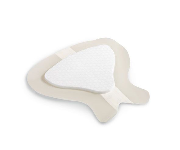 Speciális alakú kötszer a keresztcsonttáji terület ellátásához. A biztos és baktériumzáró rögzítés érdekében körbefutó